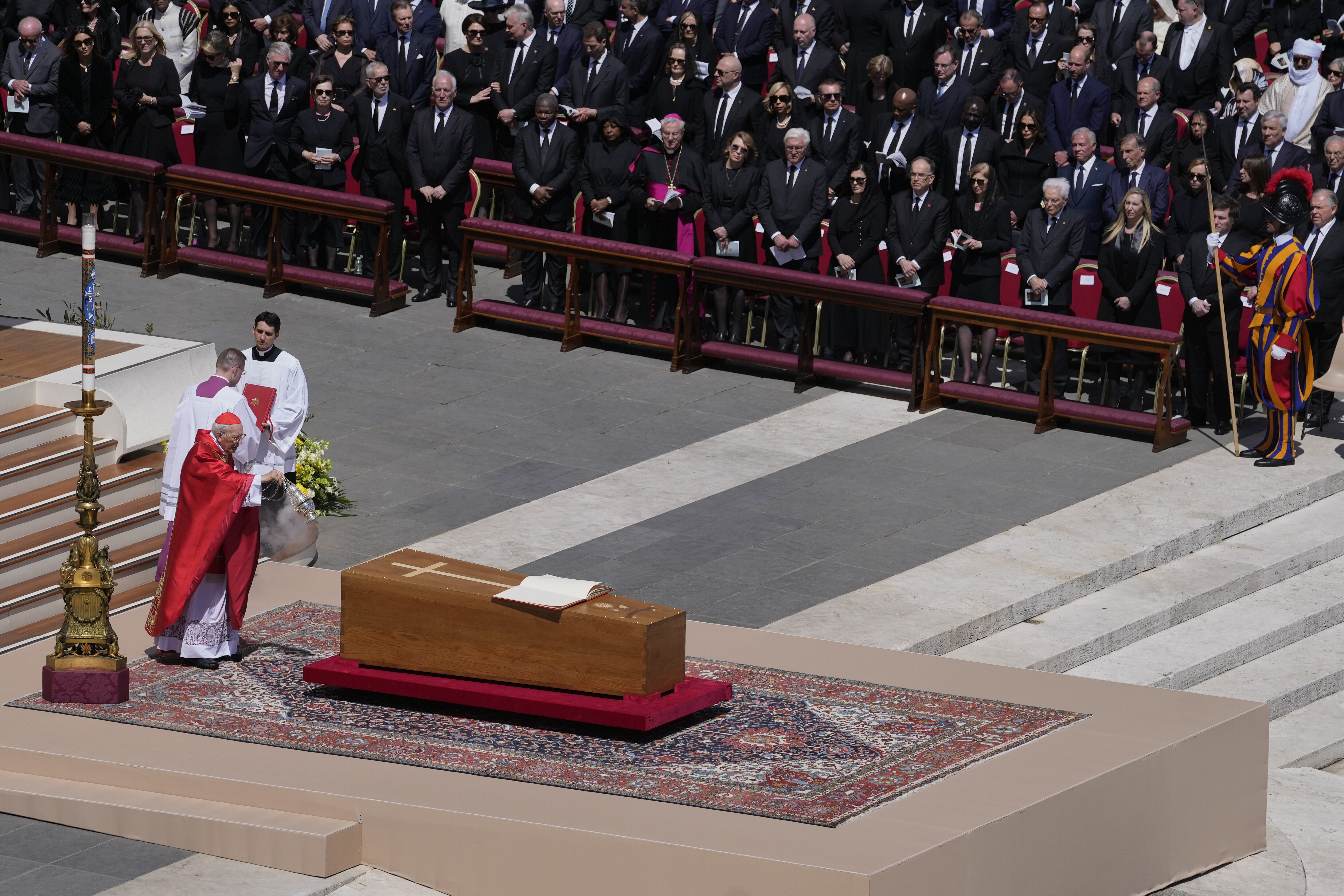 A priest stands in front of the many dignitaries and heads of state attending the funeral of Pope Francis, at St. Peter’s Square in Vatican City on April 26, 2025. (Eric Lee/The New York Times)Cardinals gather at St. Peter’s Square in Vatican City for the funeral of Pope Francis on April 26, 2025. (James Hill/The New York Times)Dean of the College of Cardinals Giovanni Battista Re blesses the coffin during the funeral of Pope Francis in St. Peter’s Square at the Vatican, April 26, 2025. (Alessandra Tarantino/AP)