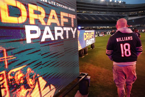 A fan wearing a Caleb Williams jersey attends the Bears draft party on April 24, 2025, at Soldier Field. (Chris Sweda/Chicago Tribune)Fans attend the Bears’ NFL draft party on April 24, 2025, at Soldier Field. (Chris Sweda/Chicago Tribune)A flag honoring Bears great Steve McMichael is waved on the 50-yard line as McMichael is remembered with a moment of silence during a Bears draft party on Thursday, April 24, 2025, at Soldier Field. (Chris Sweda/Chicago Tribune)