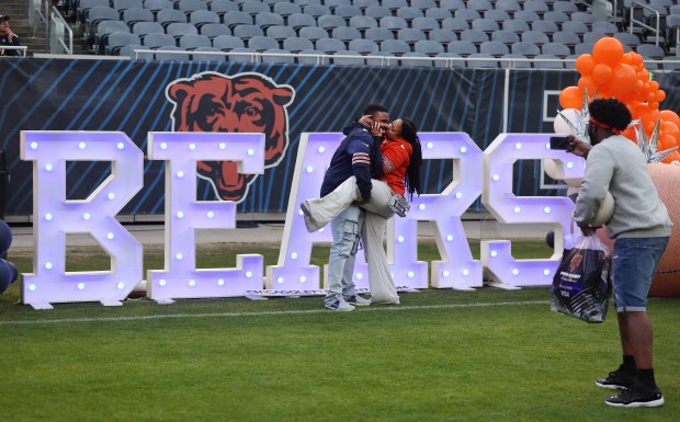Fans prepare to document the moment at a Bears draft party at Soldier Field moments before the Bears selected Michigan tight end Colston Loveland with the No. 10 pick in the first round on April 24, 2025. (Chris Sweda/Chicago Tribune)A group of children pose for a photograph while touring the Bears locker room during the Bears draft party at Soldier Field on April 24, 2025. (Chris Sweda/Chicago Tribune)Torian Hughes and Jasmine Jackson share a kiss while attending the Bears draft party at Soldier Field on April 24, 2025. (Chris Sweda/Chicago Tribune)