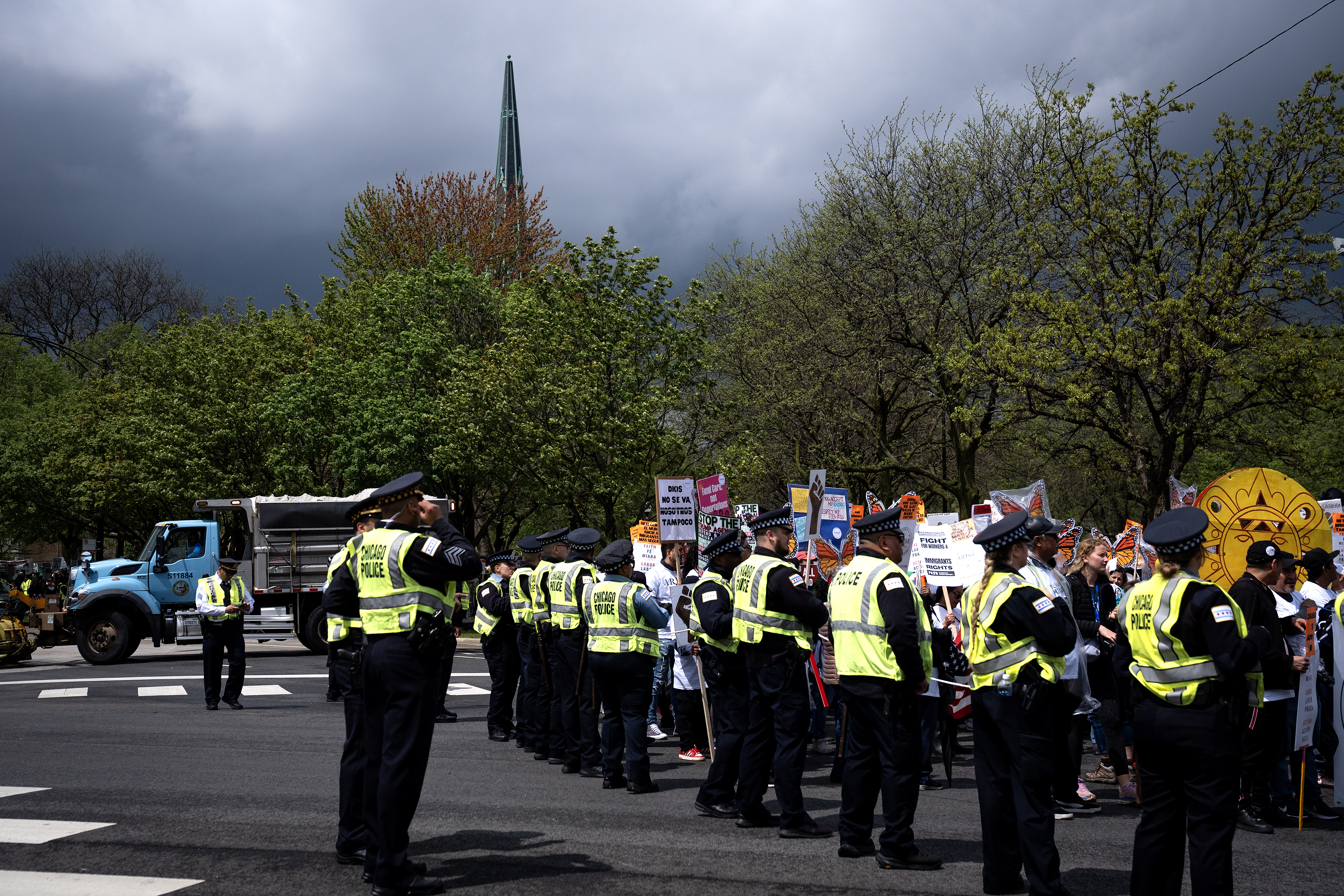 Protestors attend the May Day interfaith ceremony in Union Park, Thursday, May 1, 2025. (E. Jason Wambsgans/Chicago Tribune)Demonstrators attend the May Day interfaith ceremony in Union Park, May 1, 2025. (E. Jason Wambsgans/Chicago Tribune)Chicago police officers monitor the May Day rally and march in Union Park, May 1, 2025. (E. Jason Wambsgans/Chicago Tribune)
