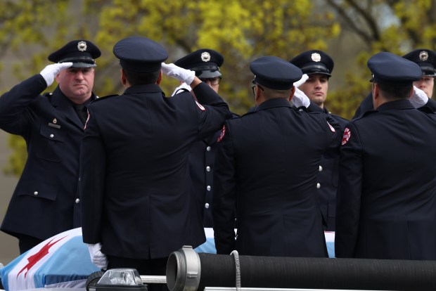 Mayor Brandon Johnson and firefighters salute as the casket of fallen Chicago Fire Department Capt. David Meyer is moved into St. John Brebeuf Church in Niles, April 29, 2025. (Antonio Perez/Chicago Tribune)Family members and loved ones look on as the casket of fallen Chicago Fire Department Capt. David Meyer is moved into St. John Brebeuf Church in Niles, April 29, 2025. Meyer was killed in the line of duty last week battling a West Side garage fire. (Antonio Perez/Chicago Tribune)Firefighters salute the casket of fallen Chicago Fire Department Capt. David Meyer before funeral services at St. John Brebeuf Church in Niles, April 29, 2025. (Antonio Perez/Chicago Tribune)