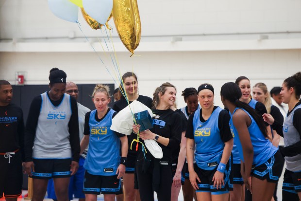 Sky VP of Basketball Operations Ann Crosby holds balloons as players and staff celebrate her 20 years of being an athletic trainer during the first day of training camp Sunday, April 27, 2025, at Sachs Recreation Center in Deerfield. (Eileen T. Meslar/Chicago Tribune)Sky forward Angel Reese answers media questions after the first day of training camp Sunday, April 27, 2025, at Sachs Recreation Center in Deerfield. (Eileen T. Meslar/Chicago Tribune)Sky center Kamilla Cardoso answers media questions after the first day of training camp Sunday, April 27, 2025, at Sachs Recreation Center in Deerfield. (Eileen T. Meslar/Chicago Tribune)