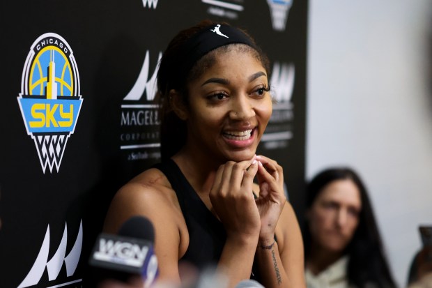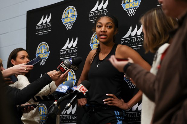 Sky forward Angel Reese answers media questions after the first day of training camp Sunday, April 27, 2025, at Sachs Recreation Center in Deerfield. (Eileen T. Meslar/Chicago Tribune)Sky center Elizabeth Williams, left, speaks to guard Kia Nurse at the end of the first day of training camp Sunday, April 27, 2025, at Sachs Recreation Center in Deerfield. (Eileen T. Meslar/Chicago Tribune)Sky forwards Angel Reese, left, and Maddy Westbeld clap in a huddle at the end of the first day of training camp Sunday, April 27, 2025, at Sachs Recreation Center in Deerfield. (Eileen T. Meslar/Chicago Tribune)